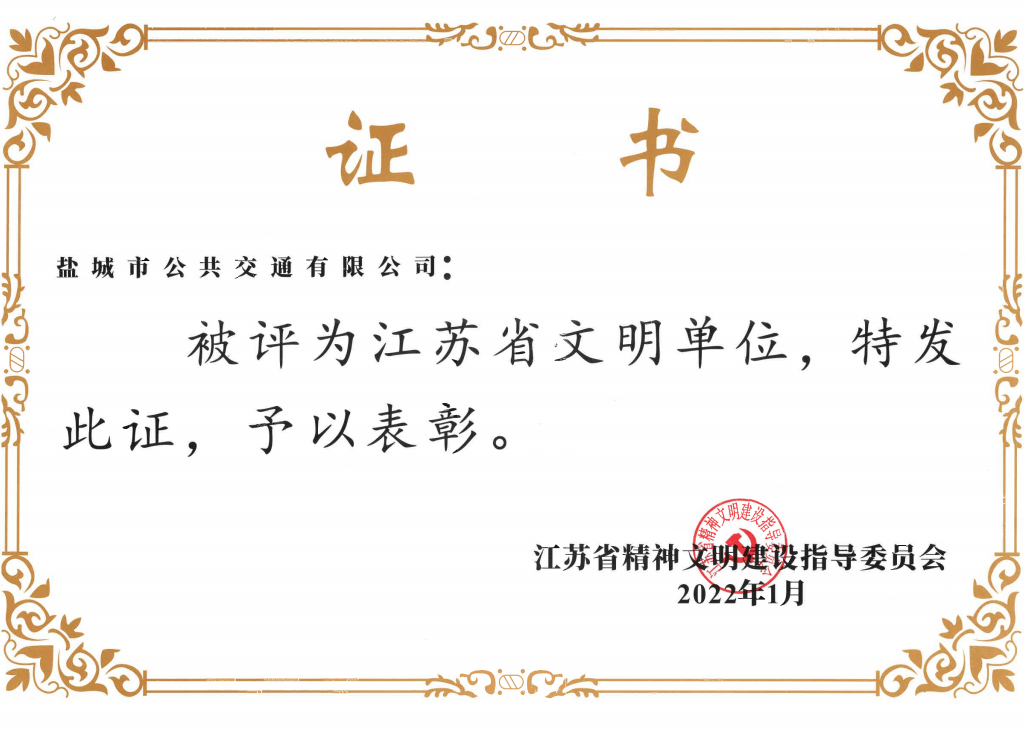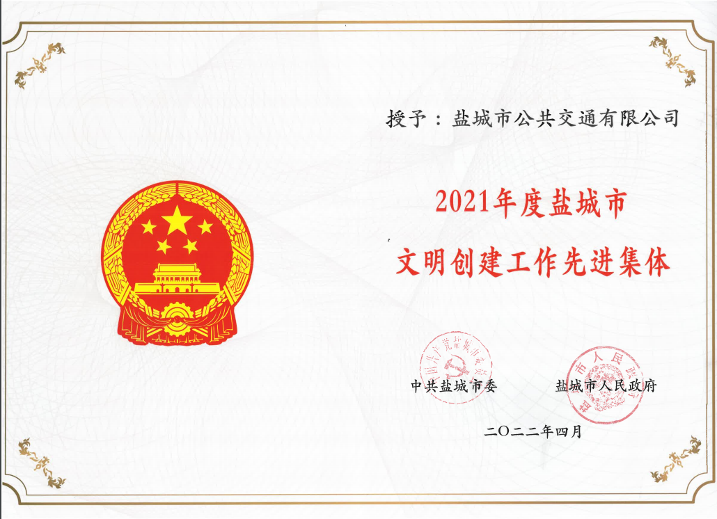 - 2022年4月公司被授予2021年度鹽城市文明創建工作先進集體榮譽稱號